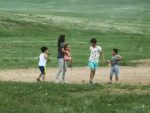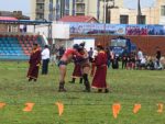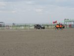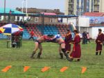 Parliamo dei luoghi che ha già visitato, ci avverte che vicino alle terme di Tsenkher Hol c’è un’epidemia di afta epizootica e non si può accedere in tutta la zona che è isolata, dalla polizia. Ci trasferiamo nel giardino della casa della guida, dove parcheggiamo e ci colleghiamo alla 220 V. Con una breve passeggiata arriviamo allo stadio, dove stanno facendo le prove del Naadam.